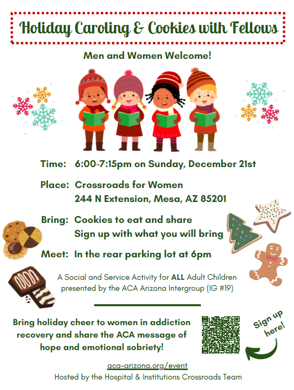 Celebrate the season by bringing holiday cheer and the message of ACA to the women at Crossroads addiction recovery facility while socializing with fellow travelers. Although this is a women-only facility, both male and female fellow travelers are invited to participate in this holiday social and service event.